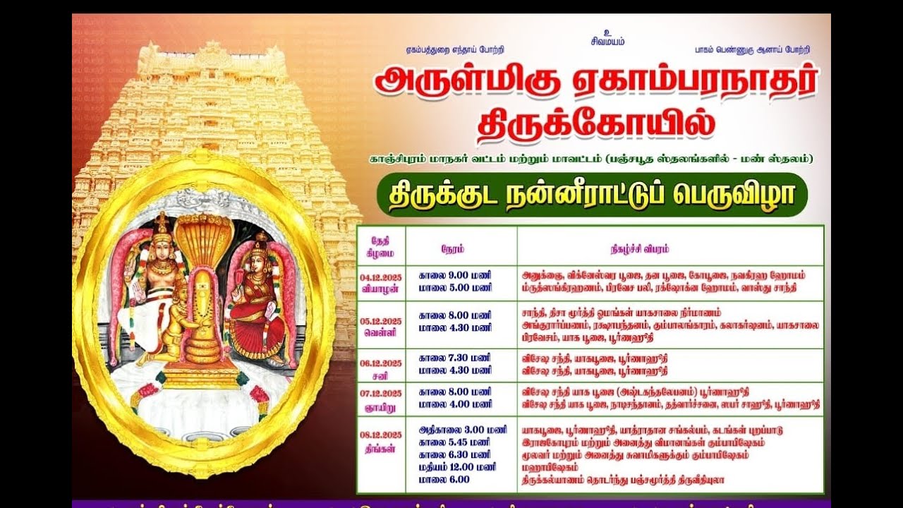 உலகப் பிரசித்தி பெற்ற காஞ்சிபுரம் ஏகாம்பரநாதர் திருக்கோயிலில் 17 ஆண்டுகளுக்குப் பிறகு மகா கும்பாபிஷேக விழா டிசம்பர் 8, 2025 அன்று கோலாகலமாக நடைபெற உள்ளது. பஞ்சபூத ஸ்தலங்களில் நிலம் (பிருத்வி) தலமாகப் போற்றப்படும் இத்திருக்கோயிலின் கும்பாபிஷேக விழாவுக்காகப் பல கோடி ரூபாய் மதிப்பில் திருப்பணிகள் மேற்கொள்ளப்பட்டுள்ளன.